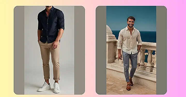 Alright dudes, ever wanna look like you just walked out of a magazine without spending hours getting ready? Check out this super simple but totally stylish look! The key is the chill vibe: a cool button-down shirt paired with some comfy chinos. Plus, those clean white sneakers are like the ultimate cheat code for instant coolness.