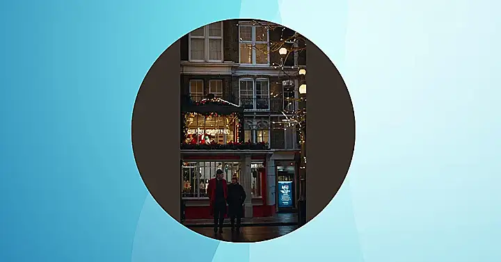 Two friends, bundled up against the London chill, stroll past a shop decked out for Christmas. Fairy lights twinkle like mischievous stars, reflecting off the glistening windows. The shop’s display looks like a scene from a Christmas movie – all cozy fireplaces and jolly Santas. It’s the kind of place where you’d expect to find magically shrinking sweaters or self-stirring hot chocolate (maybe they do, who knows!). It’s pure Christmas magic, and even these two guys seem to be caught in its spell.