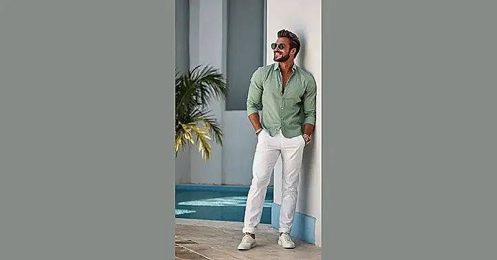 Forget the fussy ties and uncomfortable jackets. This outfit is all about looking good *without* trying too hard. The mint green shirt is fresh and vibrant, giving off major good vibes. Paired with the clean white pants and some super comfy white sneakers, you’re ready for anything – a romantic walk, a casual coffee date, or just hanging out with your Valentine and soaking up some sun. Bonus points if you add some sunglasses for that extra touch of suave!