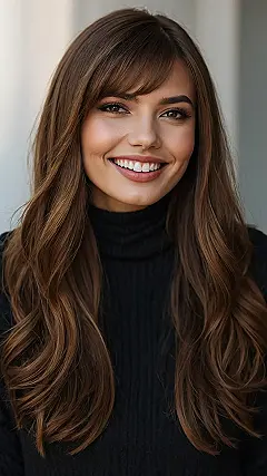 Check out this amazing hair! It’s got that ‘just stepped out of a shampoo commercial’ vibe, right? Those long, wavy locks and the cool side bangs? Total hair goals! Some haircuts are like magic tricks for your face, they just know exactly how to frame things and make everything pop. Finding a flattering cut is like hitting the hair jackpot; it makes you feel instantly ready for anything, like maybe accepting an award or just grabbing pizza after school.
