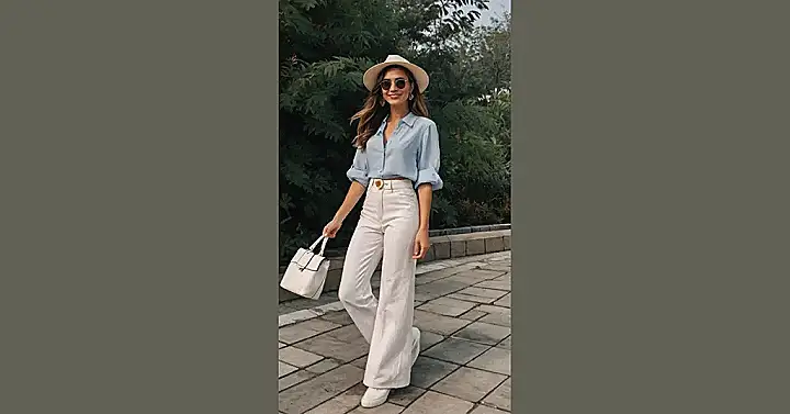 So, you wanna look effortlessly cool, like you just stepped off a yacht but you’re actually on your way to grab ice cream? This outfit’s got you covered! The light blue shirt and flowy white pants combo is like a stylish hug for your body in the summer heat. And the hat? Total boss move. Just imagine strolling around, feeling the sun on your face, and knowing you look amazing without even trying too hard.