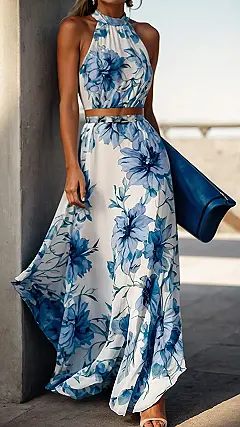 This stunning floral maxidress is like a garden party that you can wear! Imagine strolling along a beach, feeling the breeze, and looking absolutely amazing in this beautiful blue and white dress. It’s so pretty, it might even make the flowers jealous – and honestly, they wouldn’t be wrong. This isn’t your grandma’s floral print; this is modern, chic, and ready for anything from a summer barbecue to a fancy-pants graduation party (if you’re feeling bold!).