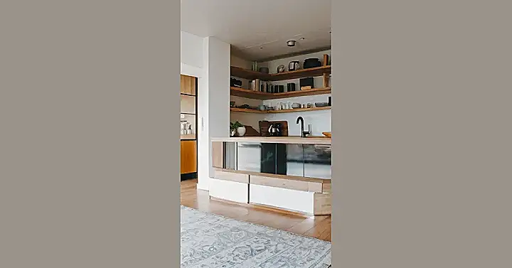 This home is all about showcasing the beauty of simplicity. The wooden shelves are a statement piece, but they’re not overloaded with stuff. It’s like a bookshelf that’s on a diet – it’s got the essentials, but it’s not trying to be a hoarder. There’s just enough to catch your eye, like a cool vintage camera or a few carefully chosen plants. Plus, that super-bright light under the cabinets is like a spotlight shining on the minimalist vibe. It’s almost like the room is whispering, “Look at me, I’m stylish and I don’t need a lot of clutter to prove it!”