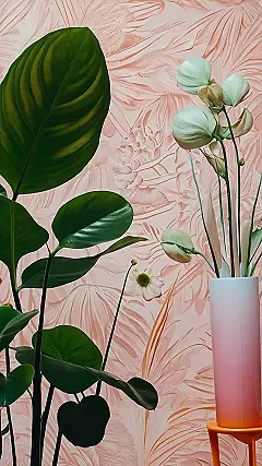 This botanical wallpaper is like Mother Nature decided to throw a super chill party in your room. You’ve got these enormous, shiny green leaves that look like they’re gossiping about the weather, and a giant white flower that’s probably the DJ for the night. The pink swirly background looks like someone spilled a strawberry milkshake and then decided to make it art. If wallpaper could vibe, this one would be playing ukulele on a beach somewhere.