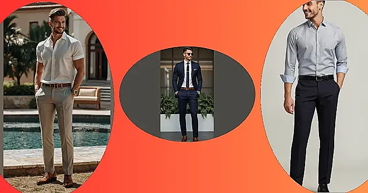 Look at this guy, looking all sharp near a pool like he’s about to have a super important business meeting about… well, maybe the best way to get a tan? Men’s business outfits aren’t always the super formal stuff you see in movies. Sometimes it’s just a cool short-sleeved shirt, nice pants, and snazzy shoes that say, “I’m professional, but I also know where the good snacks are.” It’s like business casual decided to take a vacation but still wanted to look good doing it.