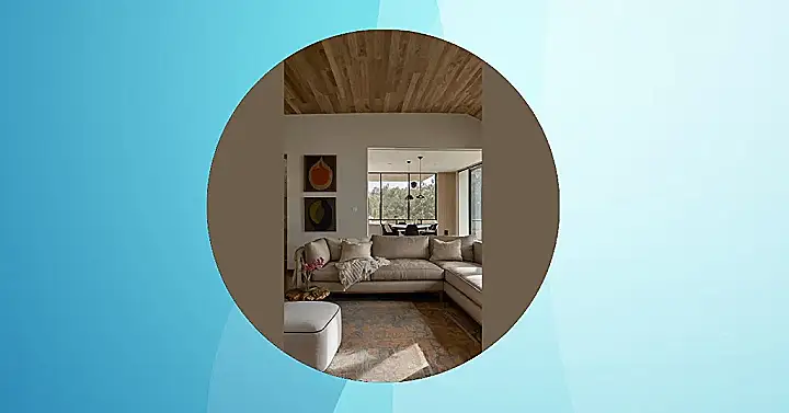 This living room is seriously chill! Imagine sinking into that comfy beige couch after a long day, maybe with a good book and a cup of hot chocolate. The wooden ceiling adds a warm, cozy touch, like a giant hug from nature. It’s all very “organic modern”—fancy words for super stylish and totally relaxed. The artwork is kinda abstract, but in a cool way, like a modern painting that someone’s really talented grandma made (she’d probably have a much nicer house than yours, too).