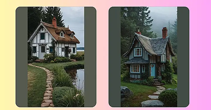 The first cottage looks like it’s straight out of a fairytale! It’s got a charming stone chimney and a roof that looks like it’s made of shingles from a thousand different trees. It’s surrounded by a lush green lawn, perfect for playing hide-and-seek or just relaxing under the warm summer sun. This cottage feels like a place where dreams come true, filled with cozy fireplaces and stories whispered in the moonlight.