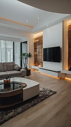 This living room is like stepping into a cozy cloud. The fluffy white sofa looks so inviting, you might just want to curl up and take a nap right there! It’s got all the makings of a perfect hangout spot – a big TV for movie nights, comfy pillows for snuggling, and a super soft rug to sink your toes into. It’s the kind of place you can imagine yourself spending hours with friends and family, laughing and chatting over a good movie. And with that big window, you can soak up the sunshine while you relax.