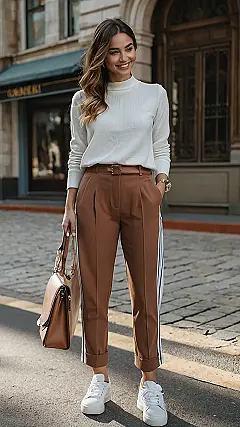 This girl knows how to rock a pair of trousers! Those brown beauties are totally on point, with their cool stripes and a cute little roll at the bottom. It’s like she took a pair of your comfy sweatpants and gave them a fancy makeover. And that white sweater? It’s the perfect touch of elegance that keeps the whole look from being too casual. She’s ready to take on the day, whether it’s conquering a test at school, going on a date, or just running errands – she’s got this!