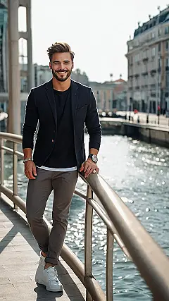 This guy knows how to rock smart casual! He’s got the perfect balance of looking put-together without being stuffy. A light blue shirt and navy pants are a classic combo that’s always a good choice. And those white sneakers? They add a touch of cool that makes the whole outfit pop. Plus, he’s got that “I’m about to conquer the world” smile – talk about confidence!