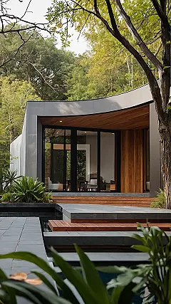 Isn’t it cool when your dream house looks like it’s straight out of a futuristic movie, but also feels super cozy and connected to nature? This place is basically a fancy treehouse for grown-ups, with its curved shape and surrounded by trees. I bet you could totally imagine yourself chilling on that wooden deck, sipping something fizzy, and pretending you’re a secret agent on a super important mission.