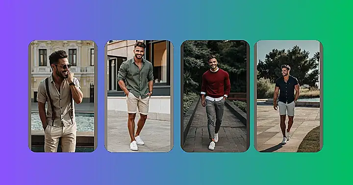 This guy’s outfit is seriously chill. Think breezy summer days, maybe a walk along the beach (or just down the street to grab ice cream!). He’s rocking a super simple look that’s anything but boring: khaki shorts, a relaxed olive green shirt, and crisp white sneakers. It’s the kind of “I woke up like this (but actually spent five minutes picking this out)” style we all secretly crave. No need for fancy stuff, just comfortable clothes that make you look and feel good. It’s the perfect example of “mens fashion casual outfits” done right!