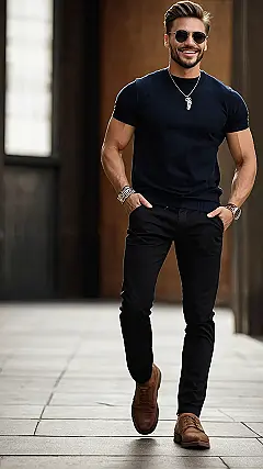 This guy’s outfit is like a cheat code for looking awesome without trying too hard! A simple black t-shirt and black jeans—sounds boring, right? But he’s totally rocked it with those stylish brown shoes. It’s the perfect example of how less is more when it comes to men’s casual fashion. Imagine yourself strolling down the street, feeling confident and comfortable, all while looking super sharp. Who needs a complicated outfit when you can nail it with a few key pieces?