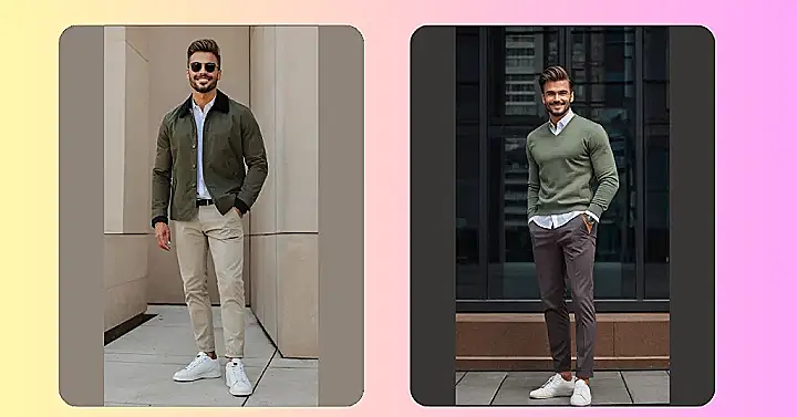 Hey there, fashion-forward ninth-graders! Check out this guy – he’s totally rocking the “mens smart casual outfits” look. It’s like the perfect blend of “I’m dressed up, but I also just want to hang out and maybe grab some pizza.” A comfy olive green sweater over a crisp white shirt? Genius! The dark pants and shoes add a bit of sophistication, without looking like he’s about to give a presentation to the United Nations. This is the kind of outfit that says, “I’m cool, confident, and ready for anything,” whether that’s a school dance or a casual Friday at work (when you’re all grown up, of course!).