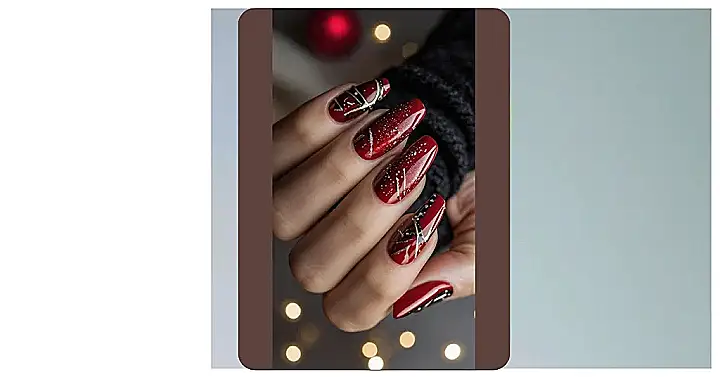 These nails are totally giving me “cozy winter vibes” – like a fancy hot chocolate with a sprinkle of gold! The deep burgundy is perfect for those chilly evenings snuggled up in a sweater, while the sparkly gold accents are like little snowflakes catching the light. It’s like someone took a beautiful winter scene and miniaturized it onto fingertips – seriously incredible!