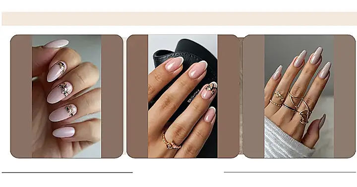 Those long, elegant nails are totally giving us major French manicure vibes! The soft, nude color is so chic, and the shape is just perfect. It’s like a grown-up version of those sparkly nail stickers you used to love as a kid, only way more sophisticated. Plus, those rings! They’re like mini works of art, all gold and twirly. It’s the perfect combination of simple and stylish – definitely Instagram-worthy.