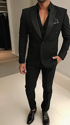 This guy is definitely feeling fancy in his all-black suit! He’s got that “I’m ready to party” look, even if it’s just a night out with friends. His slicked-back hair and sharp beard give him a sophisticated vibe, and the way he’s standing, all relaxed and confident, makes you think he’s the coolest guy in the room. You wouldn’t want to mess with him, though – maybe he’s got a hidden neuralyzer in his pocket! Just kidding, but wouldn’t it be funny if he actually worked for the Men in Black?