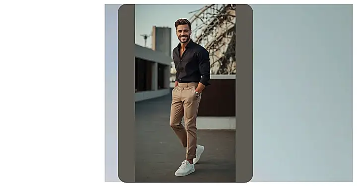 This guy’s outfit is seriously smooth! He’s rocking a dark shirt and khaki pants – it’s like the perfect blend of dressed-up and comfy. Forget stuffy suits; this is what “perfect gentleman outfits” are all about in the 21st century. White sneakers add a chill vibe that makes the whole look effortlessly cool. He’s ready for anything, from a coffee date to conquering the world (or at least acing that next history test!).