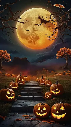 This Halloween wallpaper is full of spooky fun! Imagine a haunted house, but instead of being scary, it’s welcoming, with warm lights glowing from the windows. There’s a giant orange moon hanging in the sky, which makes the whole scene feel a bit magical. The best part? A whole bunch of friendly pumpkins are lined up on the path, smiling and ready to celebrate!