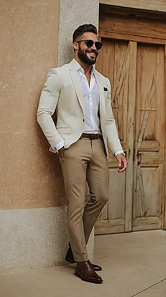 This guy’s outfit is seriously smooth! Imagine strolling down the street looking this cool – a creamy, dreamy suit that’s like a hug for your shoulders. It’s the perfect blend of fancy and relaxed, which is basically what we all aim for right? Plus, the tan trousers and brown shoes are a total match made in style heaven. It’s like he’s stepped out of a magazine and into your neighborhood. He’s definitely ready for a high-end fashion show, or maybe just grabbing a coffee – either way, he’s got the style game on lock!
