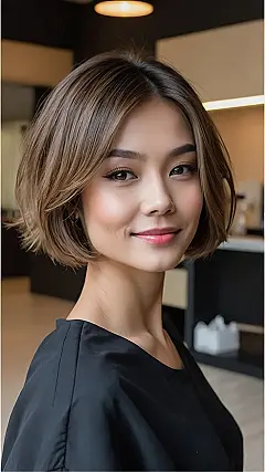 This lady’s rocking a chin-length cut that’s totally giving off “I woke up like this” vibes, even if it probably took a bit of styling. It’s like the Goldilocks of haircuts: not too long, not too short, just right for showing off your neck and adding some sass to your style. Plus, it looks super easy to manage, which is a major win when you’re trying to juggle school, friends, and that weird group project that never seems to end.