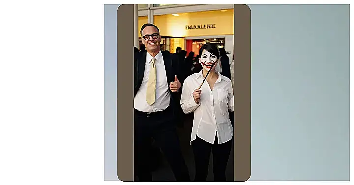 The image shows a guy in a suit, looking dapper and ready for a formal event. But wait, what’s that? His companion isn’t your average date. She’s rocking a super creepy Joker makeup that’s definitely turning heads! It looks like she’s about to make a grand entrance… or maybe a grand escape? This dynamic duo is sure to make a statement, and if you’re looking for some spooky fun this Halloween, you might need to take a note from their book.