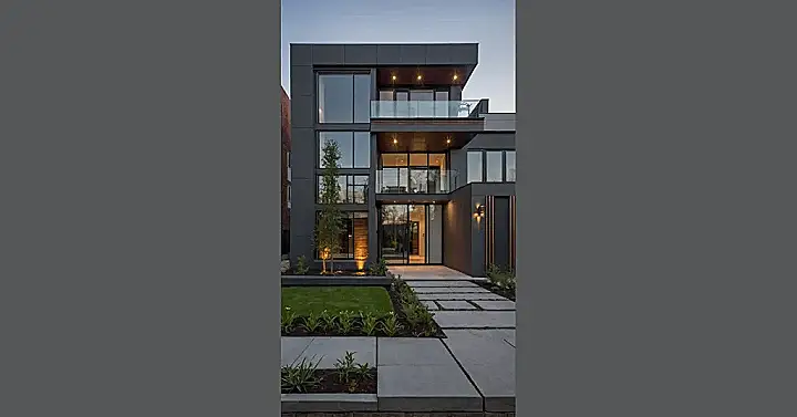 Look at those giant windows! This house isn’t shy; it’s practically wearing sunglasses the size of garage doors. And that sharp, angled roof? Total style points, like a super cool haircut. The lighting makes it look dramatic, too, like it’s posing on a red carpet. Designing the front of a house like this is all about making a big splash, making people stop and say, “Whoa, that’s a cool house!” It’s like the ultimate architectural mic drop.