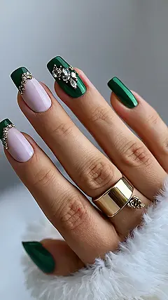 These nails are seriously next-level! Imagine walking into class with dark emerald green nails that look like they’re straight out of a fairytale. One nail is rocking a totally chic, shiny dark green, while the others are decked out in sparkly green and gold accents. It’s like your fingers decided to throw a tiny, glamorous party, and everyone’s invited – except maybe your math homework.