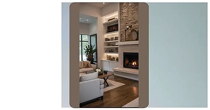 But then you look up, past the totally awesome mantle, and BAM! There’s another one! It’s like a fancy painting of a fire, framed in gold, sitting right there on the wall. This isn’t your grandma’s fireplace; it’s elevated style! You could practically have a staring contest with the flames while the downstairs fire does the heavy lifting for warmth. This living room definitely isn’t messing around when it comes to doubling down on the whole “warm and inviting” thing.