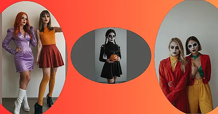It’s Halloween night and you haven’t even thought about a costume! Don’t worry, you can still be the queen of the costume party with some creativity and a little bit of help from your friends. Take a look at these two awesome ladies, they’re totally rocking the last minute costume game! On the left, you’ve got Daphne, the ultimate spooky detective, in her signature purple dress and killer white boots. And on the right, we’ve got Velma, the brains behind the Mystery Machine, in her iconic orange top and rust-colored skirt. You could even add a pair of glasses to finish the look! They’re ready to solve a spooky mystery, and with the help of their super cool costumes, they’re sure to be the talk of the town.