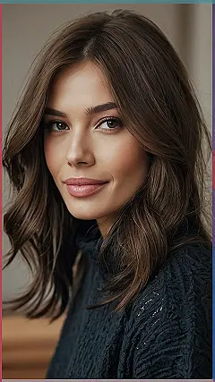 This hairstyle is like a hug for your face—but a really chic, stylish hug! See those layers? They’re perfectly placed to flatter your features, kind of like how a really good selfie filter makes you look amazing. It’s all about framing your face with soft, flowing locks. Think of it as a hairstyle that’s both effortlessly cool and totally put-together, without needing a whole lot of fuss. It’s the kind of ‘do that makes you look good even when you’re just chilling at home.