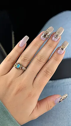 Okay, so these nails are seriously giving off magical forest fairy vibes, right? Imagine if Tinkerbell decided to get a mani-pedi – this would totally be it! The light green color is so cute and fresh, it’s like a breath of spring air. And with the gold swirling designs and little gems, it’s fancy enough to wear to prom, but still chill enough for hanging out with friends. Basically, they’re the perfect balance of sweet and sassy.