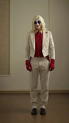 This Halloween costume is a little… off. It’s like someone tried to combine the Joker’s creepy grin with a fancy wedding suit. The white suit and red shirt are pretty snazzy, but the clown makeup? That’s not quite so elegant! Maybe they’re trying to say, “I’m not just a Joker, I’m a Joker with a sense of class! But I’m still a bit of a weirdo.” Or maybe they just forgot to take off the makeup after their last trick-or-treating adventure.