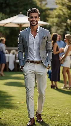 Check out this guy! He’s basically a walking example of the latest mens fashion trends without looking like he tried too hard. That light grey blazer paired with clean white and light trousers is totally in, making him look sharp but still chill enough for an outdoor vibe. It’s like he found the secret level of “dressed up” that involves zero discomfort, unlike that time you had to wear a shirt that felt like sandpaper. This look says “I clean up well” while also saying “I can actually move and breathe.” Definitely stealing some notes from his style playbook.