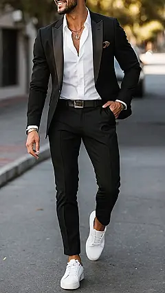 This guy’s rocking the classic black suit, but with a twist! He’s swapped out the fancy shoes for some super comfy white sneakers. It’s like he’s saying, “I’m ready for anything, from a board meeting to a night out, and I’m gonna do it in style, but without sacrificing my comfort!” He’s totally nailing the “dressed up, but not too dressed up” look, making formal outfits feel a bit more relaxed and approachable.