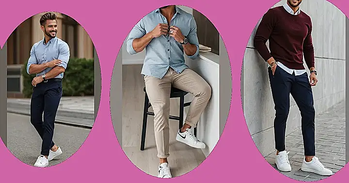 This guy is totally rocking the “smart casual” look, and it’s easy to see why! A crisp light blue shirt, paired with dark pants, gives him a polished vibe that’s perfect for a relaxed setting. And those clean white sneakers? They add a touch of sporty cool that keeps things from getting too stuffy. It’s like he’s saying, “I’m dressed for success, but I’m not afraid to kick back and have some fun!”