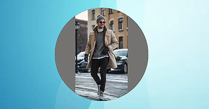 Hey there, fashion-forward friend! Check out this dude – he’s totally nailed the “winter outfits men streetwear” look. Forget those bulky, grandpa-style winter coats; this guy’s rocking a stylish camel coat that’s super chic and way more comfortable. It’s like he’s saying, “I’m warm, I’m stylish, and I’m ready to conquer the snow – one stylish step at a time!” Plus, that turtleneck and those awesome brown shoes? Perfection! He’s proving that staying warm doesn’t mean you have to sacrifice your awesome streetwear game.