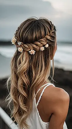This hairstyle is like your hair decided to have a glow-up party without you stressing for hours. It’s got that cool, messy braid doing its thing, pulling back just enough hair to keep things neat while letting the rest hang loose and wavy. It looks like you spent ages on it, but secretly, it’s way simpler than trying to fold a fitted sheet. This style is perfect for when you want to look cute whether you’re hitting the mall or just trying to survive algebra class.