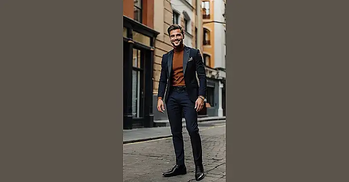 This camel-colored blazer is totally the answer to your “men Christmas party outfit” prayers! Forget the reindeer sweater – this sophisticated look is way more festive. Imagine strolling into the party, looking like you just stepped out of a holiday movie, but instead of battling snow, you’re dodging awkward uncles and questionable eggnog. The smart black trousers and brown loafers complete the outfit, ensuring you’re the best-dressed guy without trying too hard.