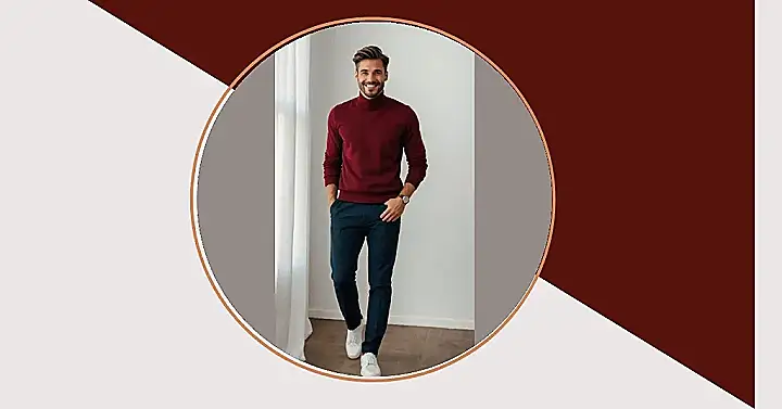 This guy’s Christmas outfit is seriously on point! That deep burgundy turtleneck is festive AF, like a cozy fireplace on a snowy night. It’s totally stylish without being too over-the-top. Pair it with some sharp black pants and polished shoes, and you’ve got yourself a look that’s perfect for Christmas dinner with the grandparents, or maybe even a holiday party with friends – no matter where you’re heading, you’ll be the best-dressed guy in the room!