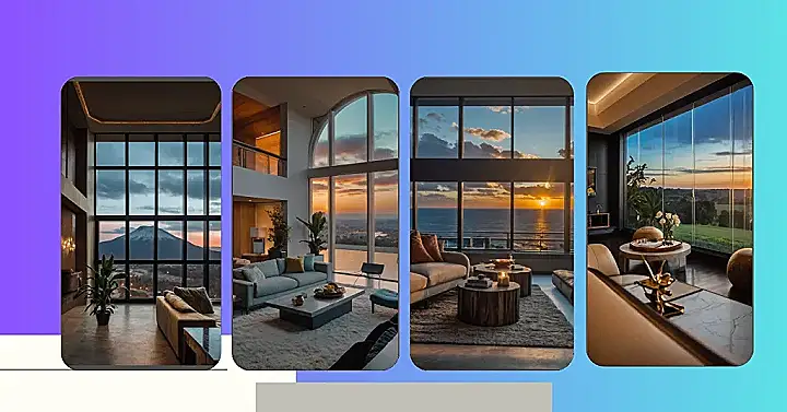 This picture shows a room with a view that’s straight out of a dream! Imagine waking up to this gorgeous sunset over the ocean every morning. It’s like having a private beach right in your living room! The warm colors of the sunset are reflected in the wooden floors, making the whole room feel cozy and inviting. It’s like stepping into a beautiful postcard.