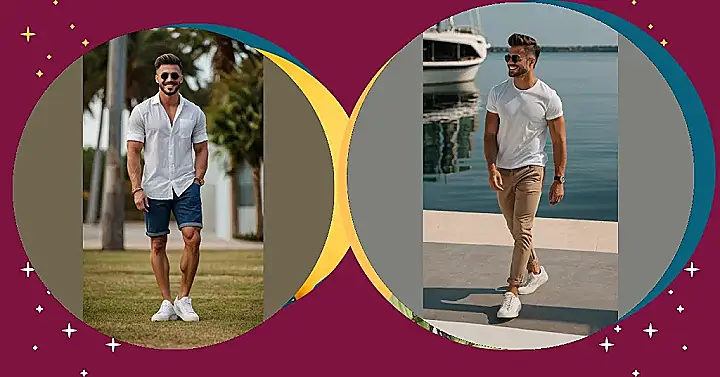 Want to look effortlessly cool this weekend? Ditch the sweatpants and take a page from this guy’s book! The open white shirt with rolled-up sleeves and those stylish blue shorts are like the perfect summer vacation starter pack. Plus, those white sneakers? Total game-changer. It’s like saying, “I’m ready for whatever the weekend throws at me, from chilling at the beach to grabbing pizza with my friends, all while looking ridiculously good.”