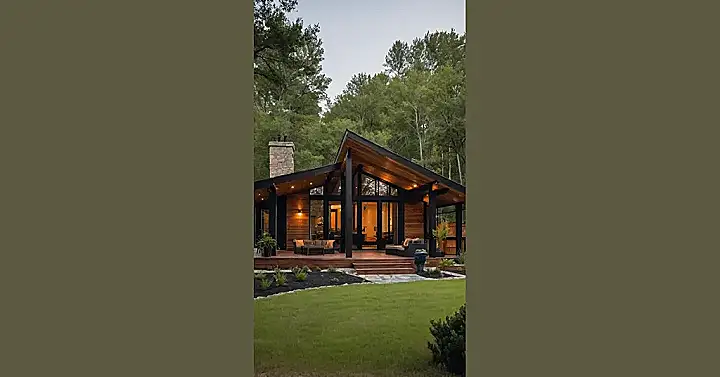 Walking up to this ranch house exterior feels like getting a digital hug from a really comfy blanket. The warm, golden light spilling out of those big windows makes you instantly think, “Yup, this is where the snacks are.” The dark wood siding is so sleek, it’s like the house is wearing a cool, understated jacket, totally owning that modern-meets-rustic look. It basically looks like it’s saying, “Welcome, leave your troubles (and maybe bring pizza).”