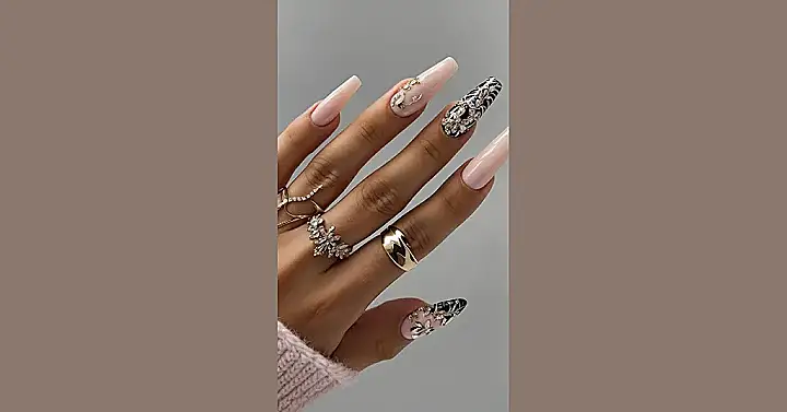 These nails are seriously out of this world! Imagine walking into school with these beauties – you’d be the total queen bee of sparkle. The mix of delicate pink and edgy black and white is like a total fashion statement, and those tiny glittering gems? They’re like mini constellations on your fingertips, perfect for catching the light and making everyone say “WOW!” You’d need a whole set of sparkly rings to match, right?