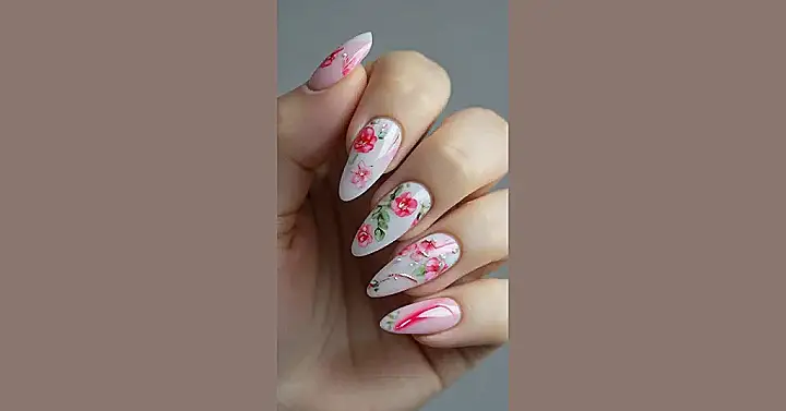 These nails are like a secret garden for your fingertips! Imagine casually strolling through school, and BAM, everyone’s suddenly obsessed with your killer style. Who needs a ring when you can rock these floral masterpieces? Just try not to poke anyone with those sharp tips while you’re showing them off.
