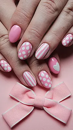 These nails are like a pink party on your fingertips! Imagine tiny polka dots and stripes snuggling up together, all dressed in pretty pink and white. It’s like a winter wonderland, but instead of snowflakes, you’ve got adorable nail art. They’re so cute, they’d make even the grumpiest snowman crack a smile. Plus, they’re super easy to do—perfect for a quick manicure even when you’re busy with homework or hanging out with friends.