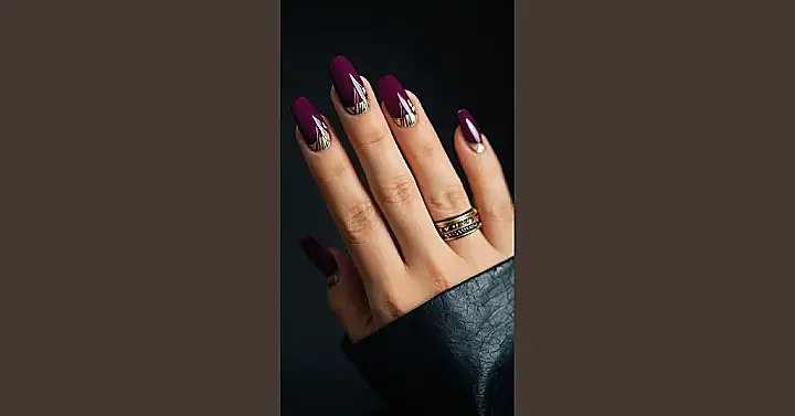 These nails are like a fancy party for your fingertips! They’re long and sleek, painted a gorgeous dark red, and then they’re topped off with tiny, sparkly leaves. It’s like someone took a tiny paintbrush and carefully drew a golden forest on each nail. You’re probably thinking, “Wow, that’s a lot of work!” And you’d be right! But imagine how awesome it would be to have super-long, shiny nails that look like they came straight from a fairytale. And the best part? You can have them for weeks! Gel nails last way longer than regular polish, so you can go from “bored with my nails” to “ooh, shiny nails” in no time.