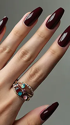 These nails are seriously giving off some “treat yourself” vibes. That dark red polish is super classy, but the little jewels and gold accents take it to a whole new level. It’s like, “I’m sophisticated, but I also like to have fun!” Plus, you could totally DIY something similar with some cheap nail gems from the drugstore. Just don’t go overboard, unless you want your nails to look like a disco ball threw up on them.