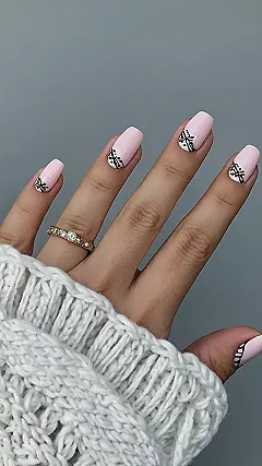 These nails are rocking a sweet and sassy look! It’s like they took all the best parts of a cute outfit—maybe a pink dress with a black ribbon—and shrunk it down to fit on your fingertips. You can almost imagine them going to a fancy tea party, sipping tiny cups of Earl Grey, and gossiping about which celebrity has the best eyebrows.