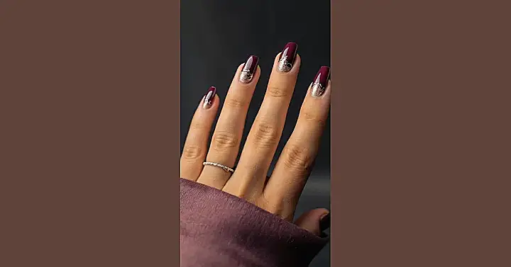 Have you ever seen such fabulous nails? These nails are the perfect mix of fall colors: a deep burgundy that’s like a cozy sweater, and a touch of gold that’s as dazzling as a pumpkin spice latte on a crisp autumn day! Just like the leaves changing color, these nails are bursting with fall vibes. You can almost hear the crunch of leaves under your feet, and smell the bonfire in the air!